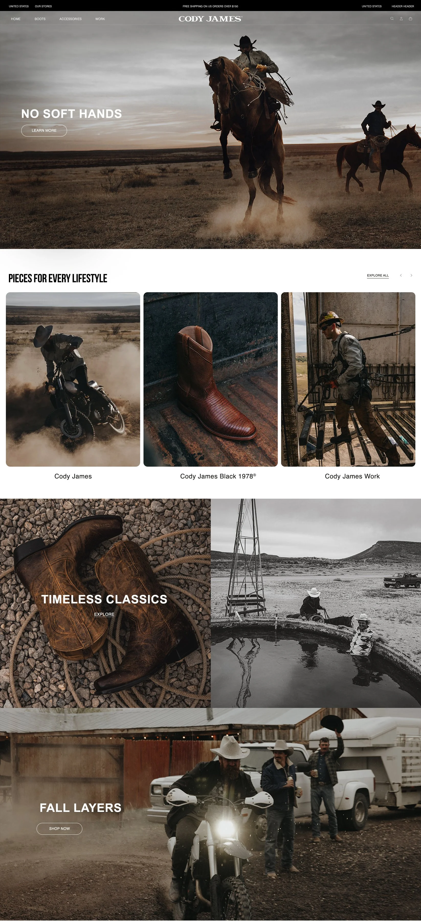 We developed a standalone Shopify experience for Cody James, positioning the brand as a more independent, fully realized label.